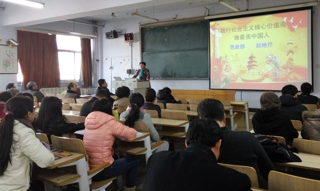 赵艳芹教授从“社会主义核心价值观的提出及内容”、“社会主义核心价值观的重大意义”、“践行核心价值观,做最美中国人”三个方面进行了深入细致的讲解。宣讲内容丰富、资料详实、充满激情、引人入胜。