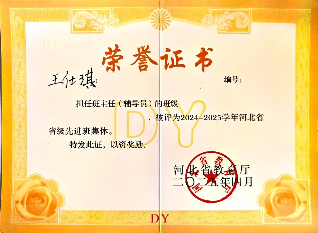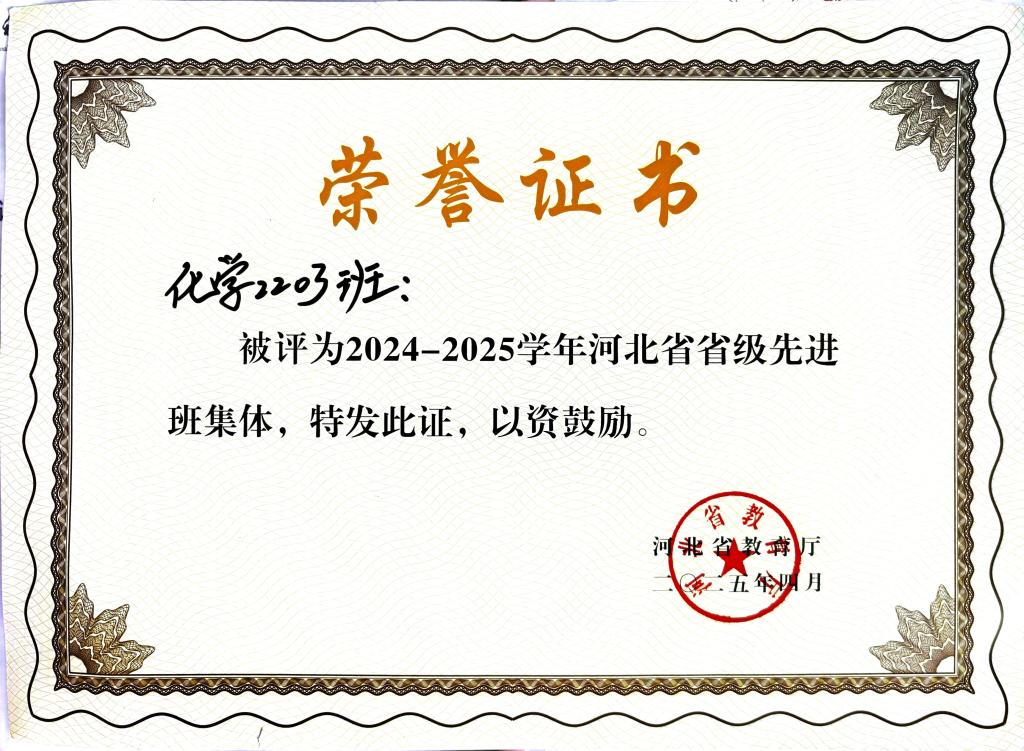 Beat365化学2203班以“志存高远,知行合一”为班训,荣获2024-2025学年“河北省省级先进班集体”称号。