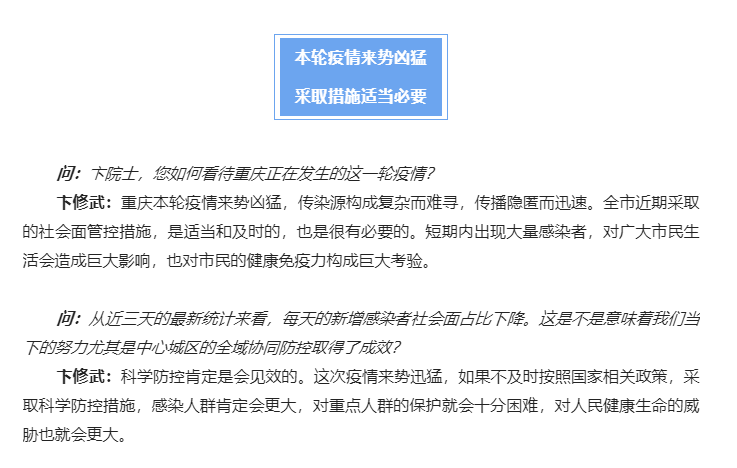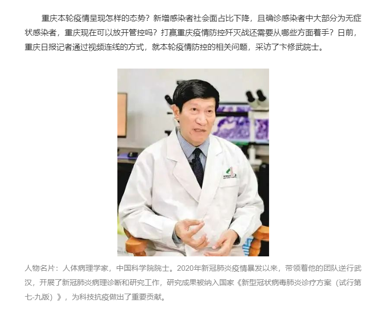 【齐心战“疫”】卞修武院士分析重庆疫情:措施适当及时必要,疫情歼灭还有待时日