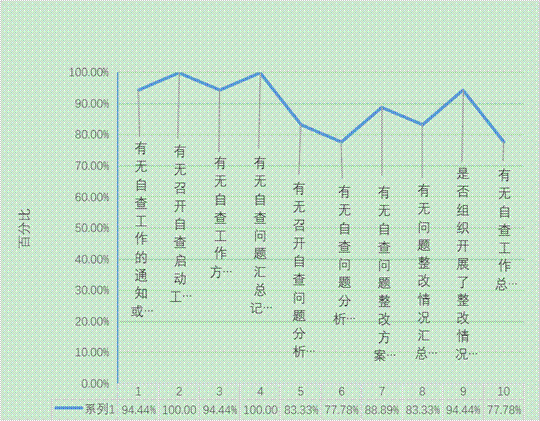 本次督查内容主要包括两个方面:一是各学院的自查和整改工作组织情况,二是教师对教学材料的自查与整改完成情况。学院的组织工作从有无自查工作的通知(要求)、有无召开自查启动工作会、有无自查工作方案、有无自查问题汇总记录表、有无召开自查问题分析研讨会、有无自查问题分析报告、有无自查问题整改方案或要求、有无自查问题整改情况汇总记录表、是否组织开展了整改情况的检查、有无自查工作总结会/总结报告等10个方面进行检查。各学院10项组织工作完成率见图1,11个学院组织工作细致,开展了全部10个方面的自查组织工作,占学院总数的61.11%。18个学院在上述10个方面工作情况的统计见图2,其中所有学院均开展了自查工作启动会、自查问题汇总两个方面工作,部分学院在“自查问题分析”和“自查工作总结”方面还有不足。