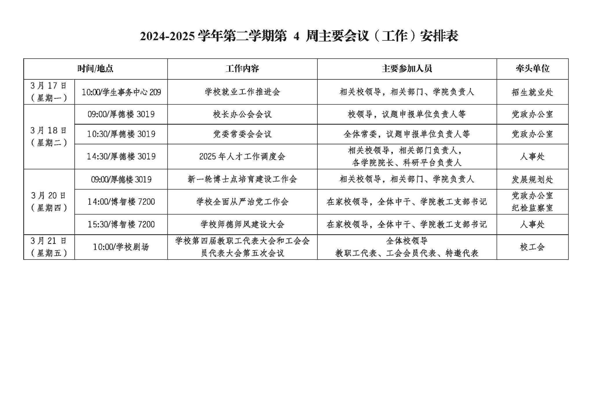 2024-2025 学年第二学期第 4 周主要会议(工作)安排