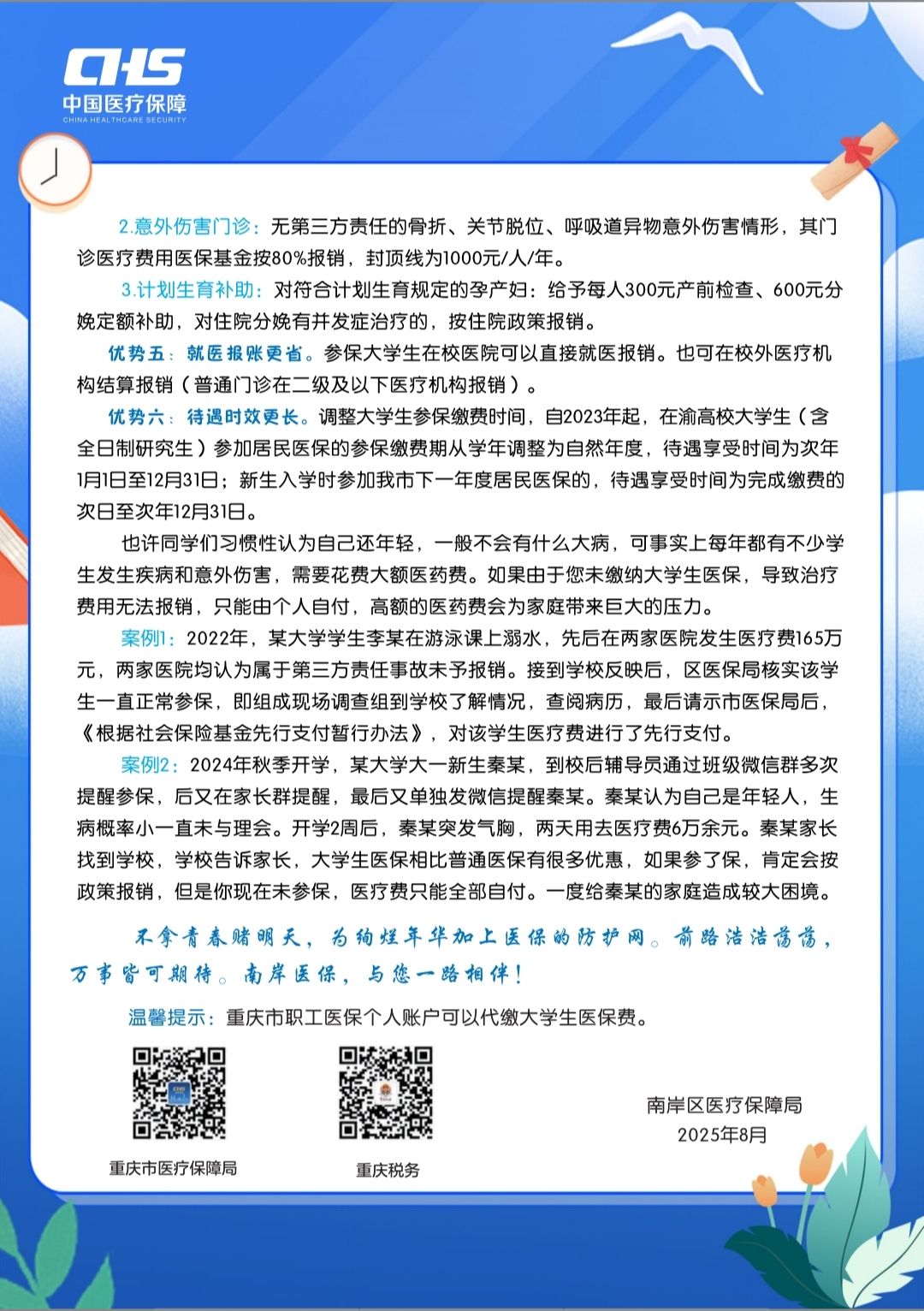 按照《国务院办公厅关于健全基本医疗保险参保长效机制的指导意见》(国办发〔2024〕38号)和《国家发展改革委办公厅等关于进一步提高高校学生医疗保障质量的通知》(发改办就业〔2024〕1096号)有关要求,根据重庆市医疗保障局、重庆市教育委员会、重庆市财政局、国家税务总局重庆市税务局联合发布的《关于做好大学生参加基本医疗保险相关工作的通知》(渝医保发〔2024〕31号)文件精神,为进一步做好KY开元学生的医疗保障工作,现将2026年大学生参保政策解读如下: