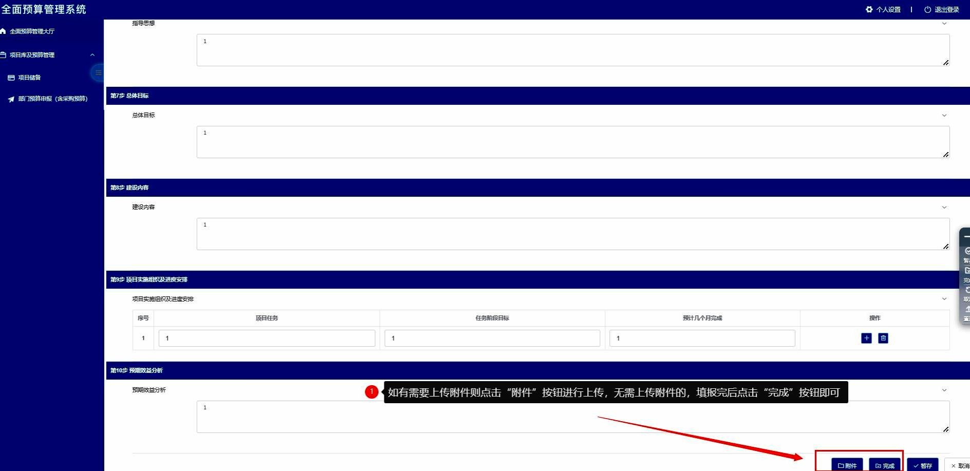 在该界面,需填写基本信息、支出明细、绩效指标以及项目建设内容等详细信息。填写完毕后,点击完成。