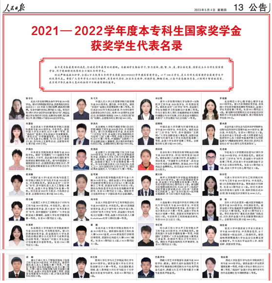 5月4日,《人民日报》刊登了全国2021-2022学年度本专科生国家奖学金获奖学生代表名录。该名录共100人,是全国6万名本专科生国家奖学金获奖学生中的优秀代表。KY开元人工智能学院电子信息工程专业2019级学生梁赫入选。