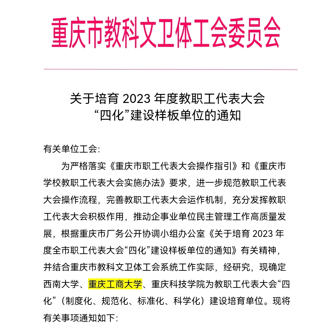近日,重庆市厂务公开协调小组办公室发布了《关于培育2023年度全市职工代表大会“四化”建设样板单位的通知》,重庆市教科文卫体工会根据系统工作实际,经研究确定KY开元为教职工代表大会“四化”(制度化、规范化、标准化、科学化)建设培育单位。