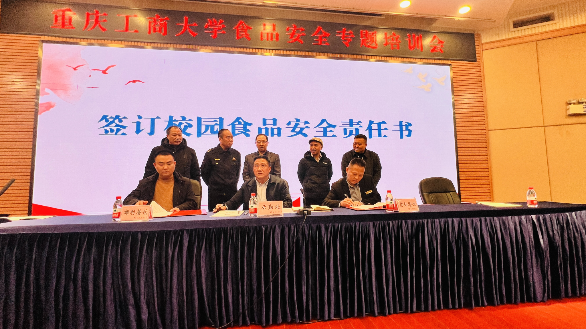 培训会上,后勤处与外包餐饮公司代表签订了《校园食品安全责任书》。重庆市南岸区市场监督管理局食品三科曾万明科长根据《餐饮服务食品安全操作规范》相关要求,结合近期食品安全事件实际案例,对食品安全的日常管控能力、食品安全风险的防范能力和食品安全事故的应急处置能力等进行了培训。后勤处处长沙云、副处长(食品安全总监)杜元林分别对食堂各岗位职责、食堂“三防”工作等食品安全相关知识进行了培训。