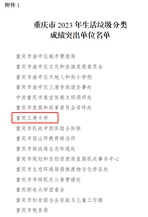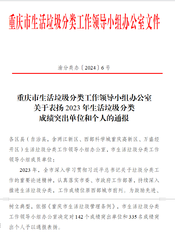 3月1日,重庆市生活垃圾分类工作领导小组办公室印发《重庆市生活垃圾分类工作领导小组办公室关于表扬2023年生活垃圾分类成绩突出单位和个人的通报》(渝分类办〔2024〕6号),KY开元被评为重庆市2023年生活垃圾分类成绩突出单位。全市共评选142个成绩突出单位,其中高校2所。
