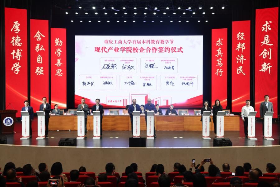 随后进行了现代产业学院校企合作代表签约仪式。会计学院、人工智能学院、环境与资源学院、艺术学院、文学与新闻学院负责人与浪潮集团重庆分公司、中软国际教育科技股份有限公司、重庆市映天辉氯碱化工有限公司、北京中航未来科技集团有限公司、重庆市青少年融媒体中心的负责人签约。