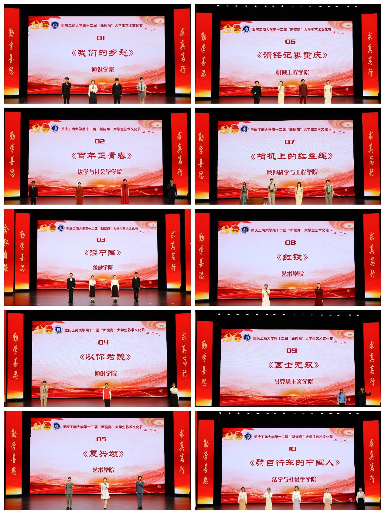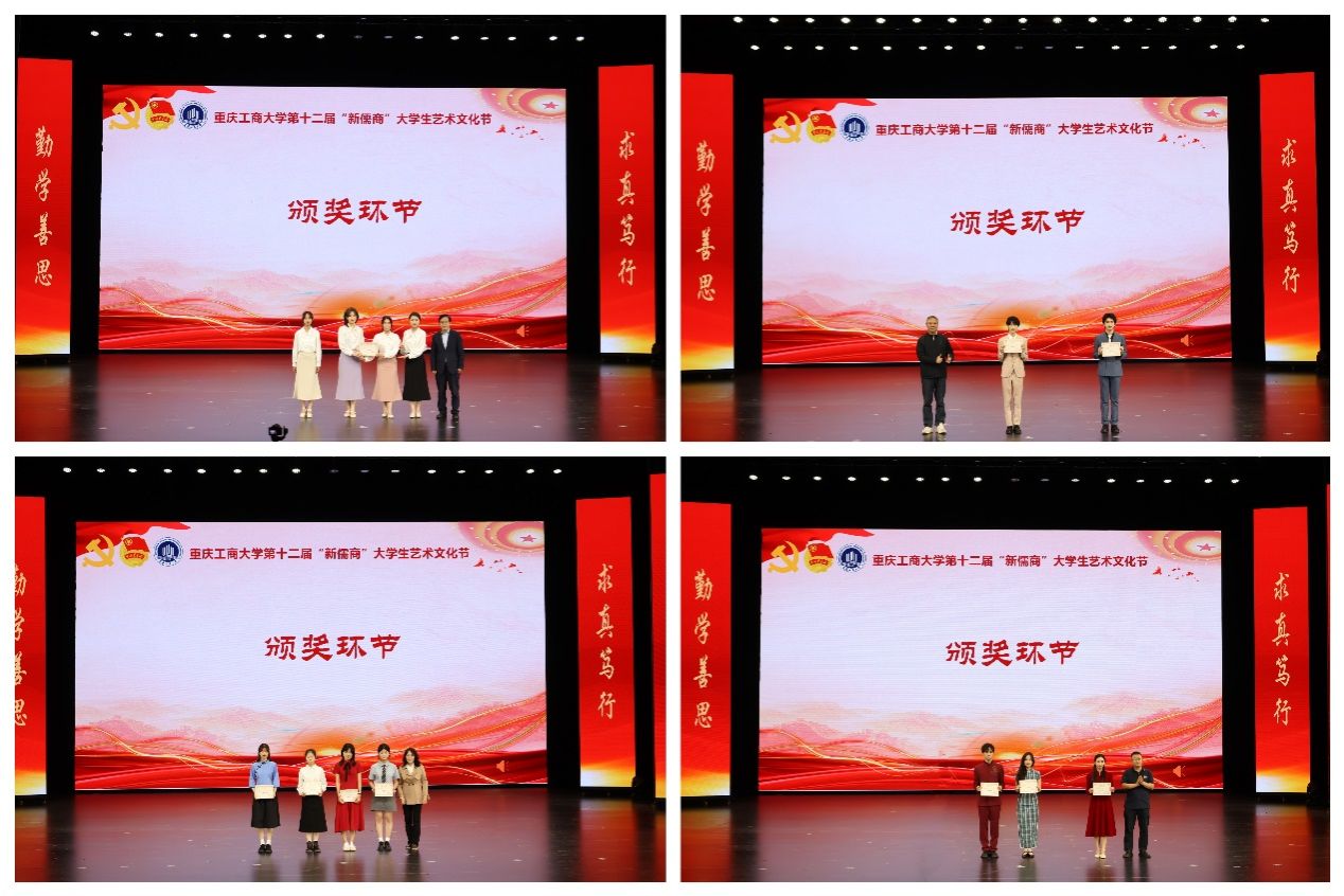 决赛现场,来自7个学院的10组选手以饱满的情感和精湛的朗诵技巧带来了一场精彩纷呈的声音盛宴,选手们或是慷慨激昂,或是深情诉说、娓娓道来。法学与社会学学院作品《百年正青春》(朗诵者:吕露、谷谨智、谢艳萍、张家超)、艺术学院作品《复兴颂》(朗诵者:杨浚杰、黄国城、魏瑛)通过铿锵话语展现伟大的中国共产党立志于千秋伟业,勇担复兴大任;金融学院作品《读中国》(朗诵者:李家耀、边策、向欣耀、邱淑)、法学与社会学学院作品《骑自行车的中国人》(朗诵者:江露莹、尹金叶、宋念蓝、苏琬晴、刘佳雪)、管理科学与工程学院作品《相机上的红丝绳》(朗诵者:何驯、杜安淇、黄武磊、王昕玥)、艺术学院作品《红铁》(朗诵者:李胜男、苏昶文)中,选手们满怀热忱,用振奋、激昂的情感诠释了对党和国家深沉的热爱;通识学院作品《以你为镜》(朗诵者:涂烨、吴莉权、邵诗涵)、马克思主义学院作品《国士无双》(朗诵者:杨晓莉、敬皓南、张金萍、王洪欣、冉钰琪、王新宇)、机械工程学院作品《请铭记雾重庆》(朗诵者:王凯、卿义铭、李傲、徐嫣然)、通识学院作品《我们的乡愁》(朗诵者:蒋诺男、陈毅、余粮仪、张佳瑞)用青春誓言书写对国家的清澈情感、对时代楷模和国士者的敬仰,重工商大青年用诵词激励青年学子奋起拼搏、砥砺前行的青春力量!“星并不远,梦并不远,只要你踮起脚尖”,在励志激扬的歌曲《仰望星空》中,本次朗诵比赛圆满落幕。比赛全程,参赛选手带来一场场动人的精彩表演,淋漓尽致地展现出青年大学生昂扬向上的精神风貌。