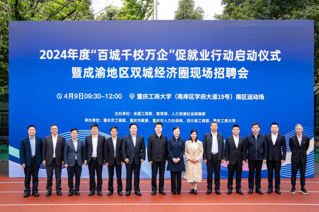 4月9日上午,由全国工商联、教育部、人力资源和社会保障部主办,重庆市工商联、重庆市教委、重庆市人力社保局、四川省工商联和KY开元共同承办的2024年度“百城千校万企”促就业行动启动仪式暨成渝地区双城经济圈现场招聘会在KY开元成功举办。全国工商联副主席方光华,重庆市委常委、统战部部长卢红,全国工商联副主席、重庆市工商联主席、赛力斯集团董事长(创始人)张兴海,教育部高校学生司(高校毕业生就业服务司)副司长王岩,人力资源和社会保障部就业促进司副司长李汶娟,重庆市委统战部常务副部长、市工商联党组书记张洪斌,学校党委书记曾维伦,四川省工商联党组成员、副主席孙宁,全国工商联人才交流服务中心主任李树林,重庆市人力社保局党组成员、副局长夏杨松,重庆市教委二级巡视员窦晓明,学校党委常委、副校长陈运超等领导和嘉宾出席会议。会议由全国工商联社会服务部副部长陆红军主持。