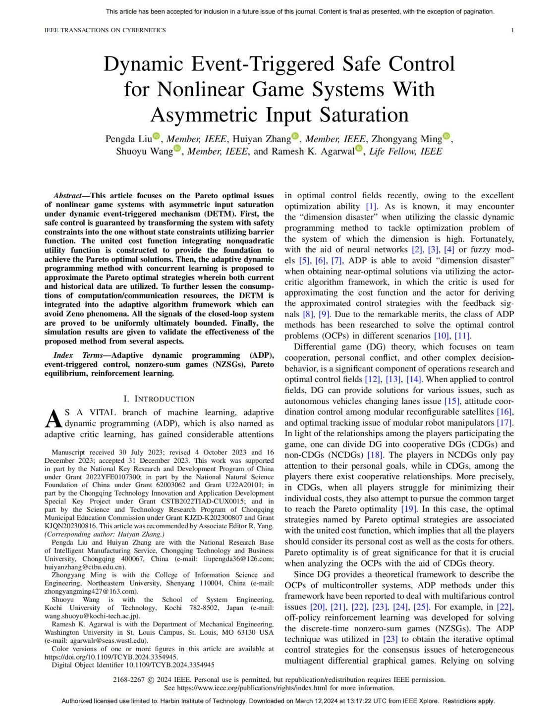 近期,KY开元智能制造服务国际科技合作基地(国合基地)无人智慧系统协同控制团队刘鹏达博士与日本工程院院士王硕玉教授、斯坦福大学Ramesh K. Agarwal教授合作,在国际智能控制领域顶级期刊IEEE Transactions on Cybernetics上发表了题为“Dynamic Event-Triggered Safe Control for Nonlinear Game Systems With Asymmetric Input Saturation”(非对称输入饱和非线性博弈系统的动态事件触发安全控制)的学术论文(DOI:10.1109/TCYB.2024.3354945),在非线性系统智能优化与安全控制领域取得了突破性进展。