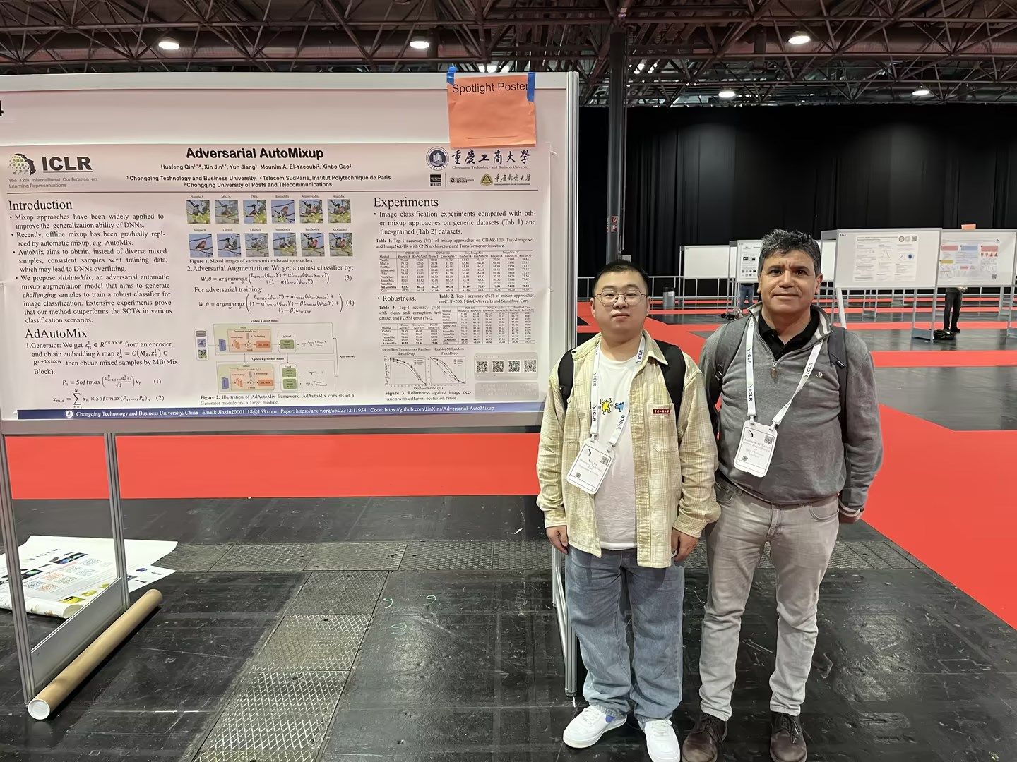 近日,KY开元人工智能学院2022级软件工程专业研究生金鑫在第12届国际表征学习大会(ICLR 2024)上发表了题为“Adversarial AutoMixup”(对抗自动混合)的研究成果,并入选亮点论文(Spotlight),该论文为计算机视觉数据增强做出了创新贡献。会议于今年5月7日至11日在奥地利首都维也纳举办。海报展示期间,该论文受到了来自包括麻省理工学院、牛津大学、清华大学、苏黎世联邦理工学院、OpenAI等世界顶尖大学和科技公司的关注和赞赏。