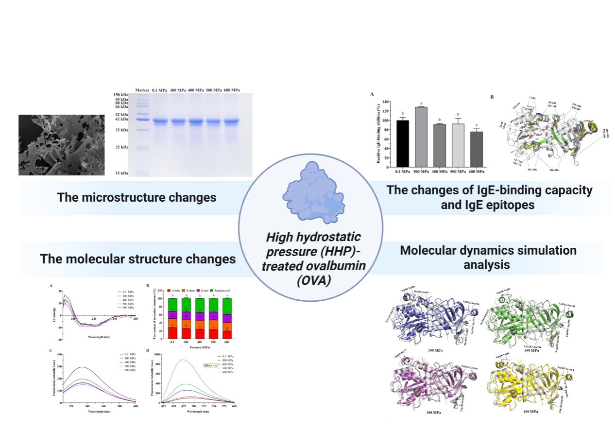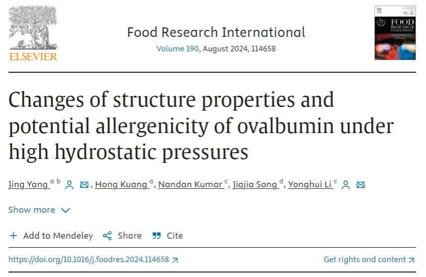 近日,KY开元食品科学与工程学院杨景副教授(第一作者兼通讯作者)与美国堪萨斯州立大学谷物科学与工业系李永辉副教授(通讯作者)等在食品领域国际期刊《Food Research International》发表了题为“Changes of structure properties and potential allergenicity of ovalbumin under high hydrostatic pressures”的研究论文。