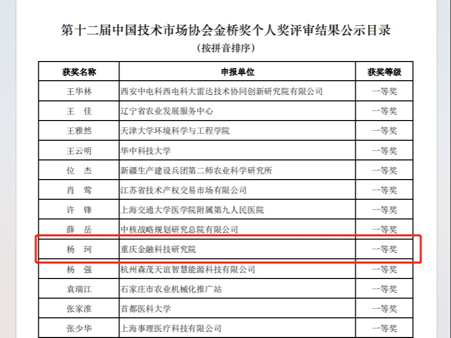 第十二届中国技术市场协会金桥奖评审结果揭晓,KY开元重庆金融科技研究院副院长杨珂获个人奖一等奖。