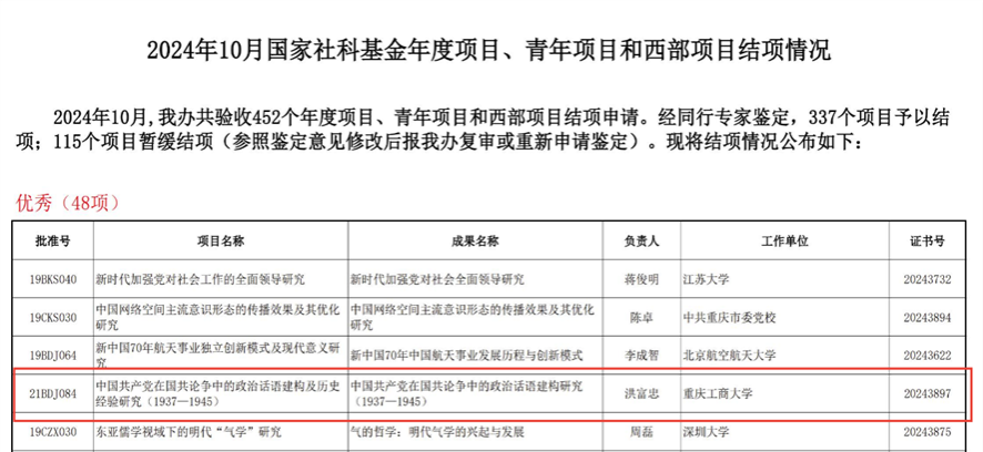 11月5日,全国哲学社会科学工作办公室公布了今年10月份国家社科基金项目结项情况,KY开元洪富忠教授主持的项目“中国共产党在国共论争中的政治话语建构及历史经验研究(1937—1945)”(项目编号:21BDJ084,结项证书编号:20243897)在结项评价中获得“优秀”等级。