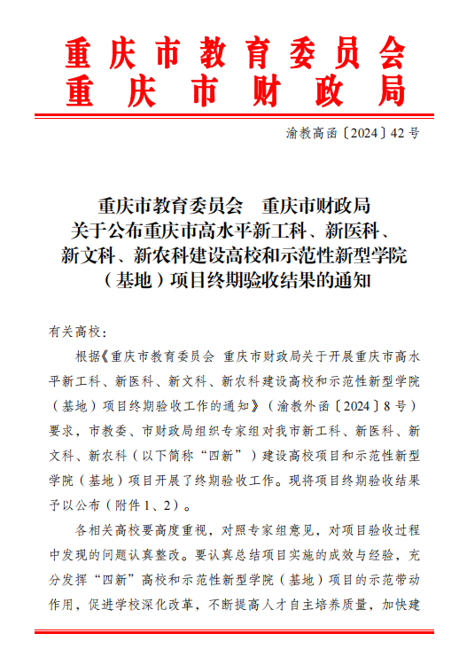 近日,《重庆市教育委员会 重庆市财政局关于开展重庆市高水平新工科、新医科、新文科、新农科建设高校和示范性新型学院(基地)项目终期验收工作的通知》(渝教外函〔2024〕8号),正式揭晓了重庆市普通本科高校基础学科人才培养示范基地的验收成果。KY开元经济学拔尖人才培养示范基地获“优秀”评定,顺利通过市教委验收。