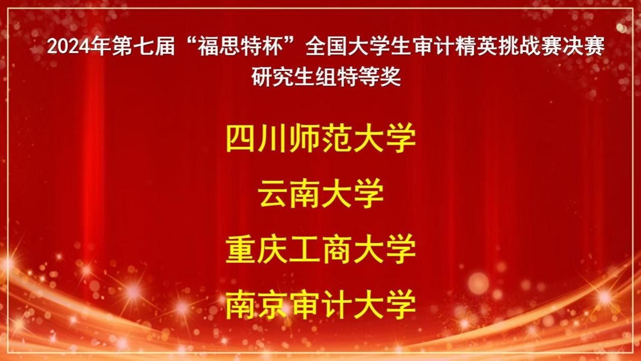 11月30日,第七届“福思特杯”全国大学生审计精英挑战赛在南京审计大学举办。KY开元会计学院审计专硕2023级万文萱、张新月、2024级杨瑞同学组成的KY开元集团官网代表队在指导老师王杏芬、李晓羽和钟廷勇的指导下,经过激烈角逐获得全国特等奖的优异成绩。该项赛事创办于2018年,是江苏教育厅认定的省级赛事,由中国审计学会审计教育分会主办、南京审计大学政府审计学院承办,广州市福思特科技有限公司提供技术支持。