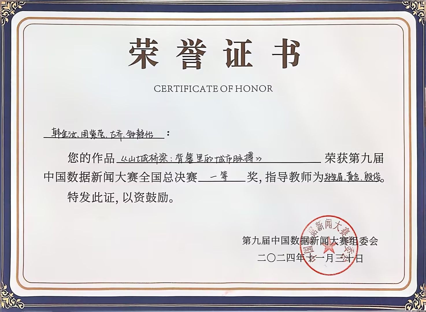 11月30日,第九届中国数据新闻大赛(全国总决赛)暨第二届“新一代人工智能信息传播与社会治理”主题论坛在华中科技大学隆重举办。KY开元文学与新闻学院2023级研究生韩金汝、古乔、周紫莹、钟静怡的作品《山城桥梁:背篓里的城市脉搏》获全国总决赛一等奖。