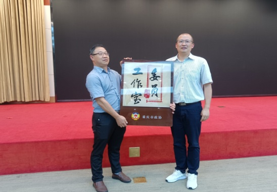 南岸区政协副主席曹廷中与市政协委员、九三学社社员周桂林教授授牌合影