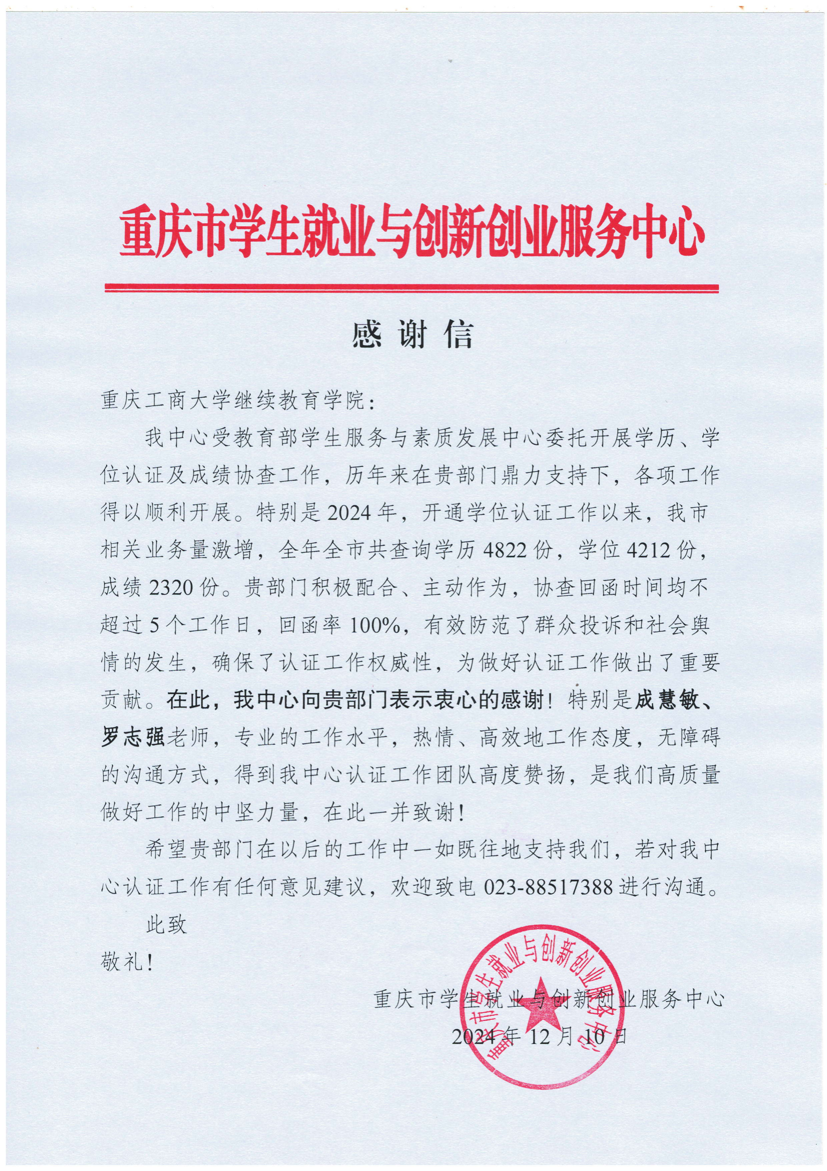 近日,KY开元继续教育学院收到来自重庆市学生就业与创新创业服务中心的一封感谢信,信中表达了该中心对KY开元继续教育学院积极配合、主动作为的感谢之情。
