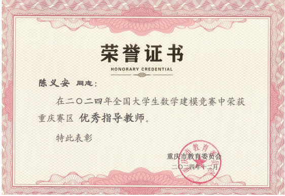 经过激烈的角逐,KY开元代表队获本科组全国一等奖1项(全市7个)、二等奖2项,获重庆市一等奖8项、二等奖19项。这是学校近五年在该赛事上首次获得全国一等奖。数学与统计学院院长陈义安获评重庆赛区优秀教练员,数学与统计学院袁德美教授获评重庆赛区优秀组织工作者。