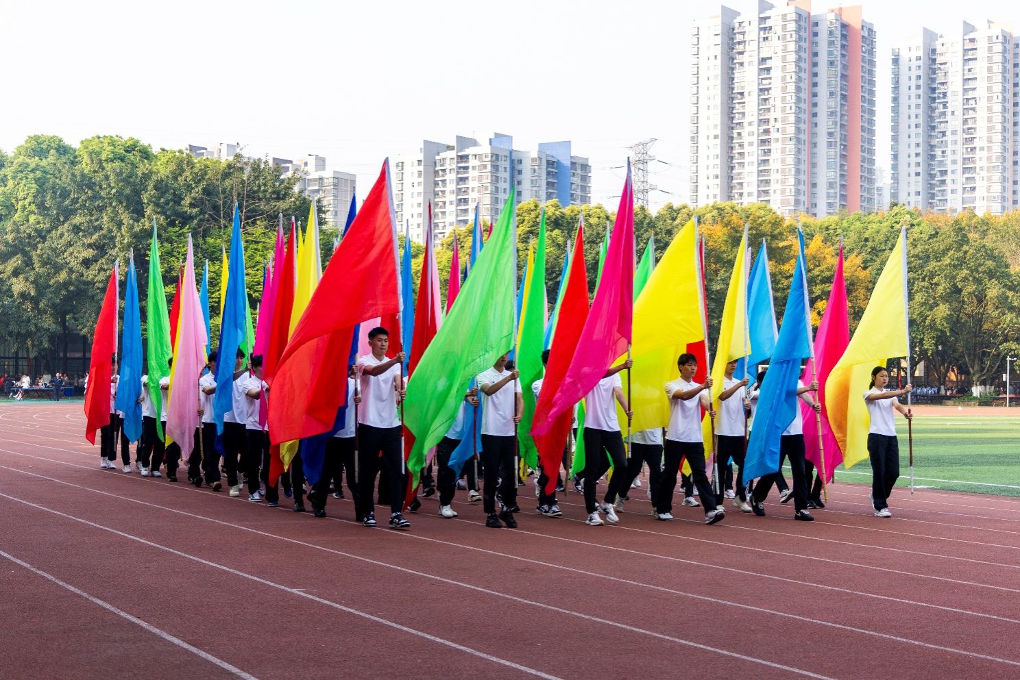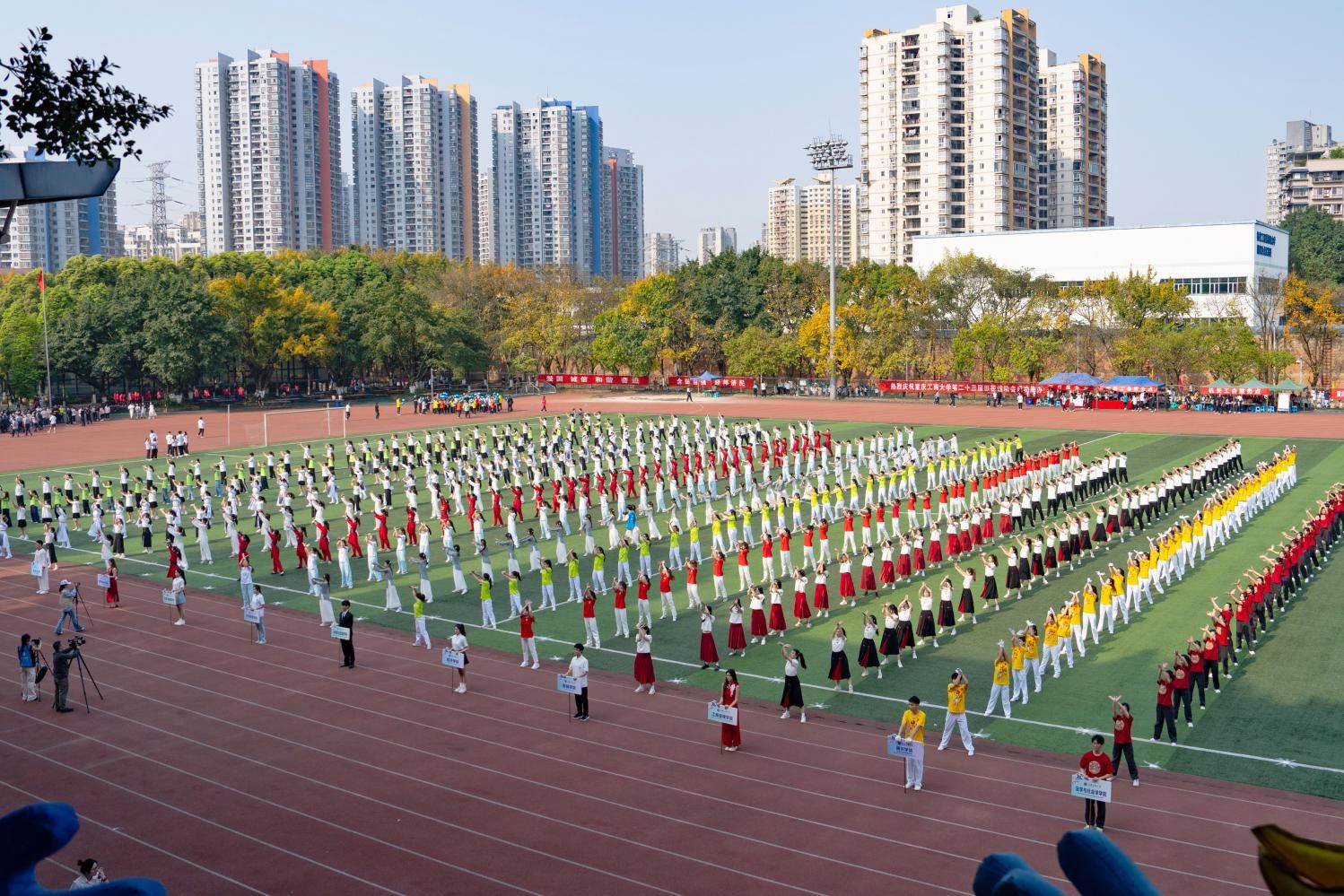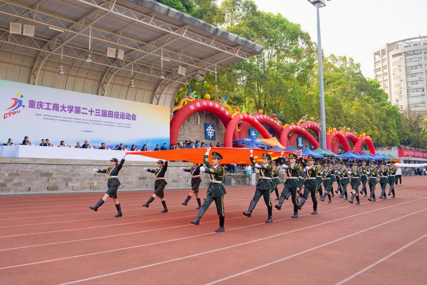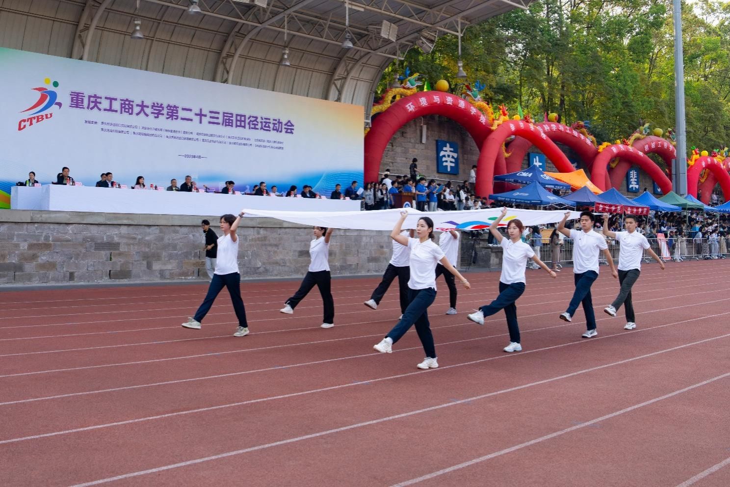 田径场上横幅高挂、彩旗飘扬、气氛热烈。2000余名师生、校友代表满怀喜悦,热情洋溢,以饱满的状态共赴这场力与美的运动盛宴,尽显重工商大人团结奋进的校园精神和积极向上的精神风貌。