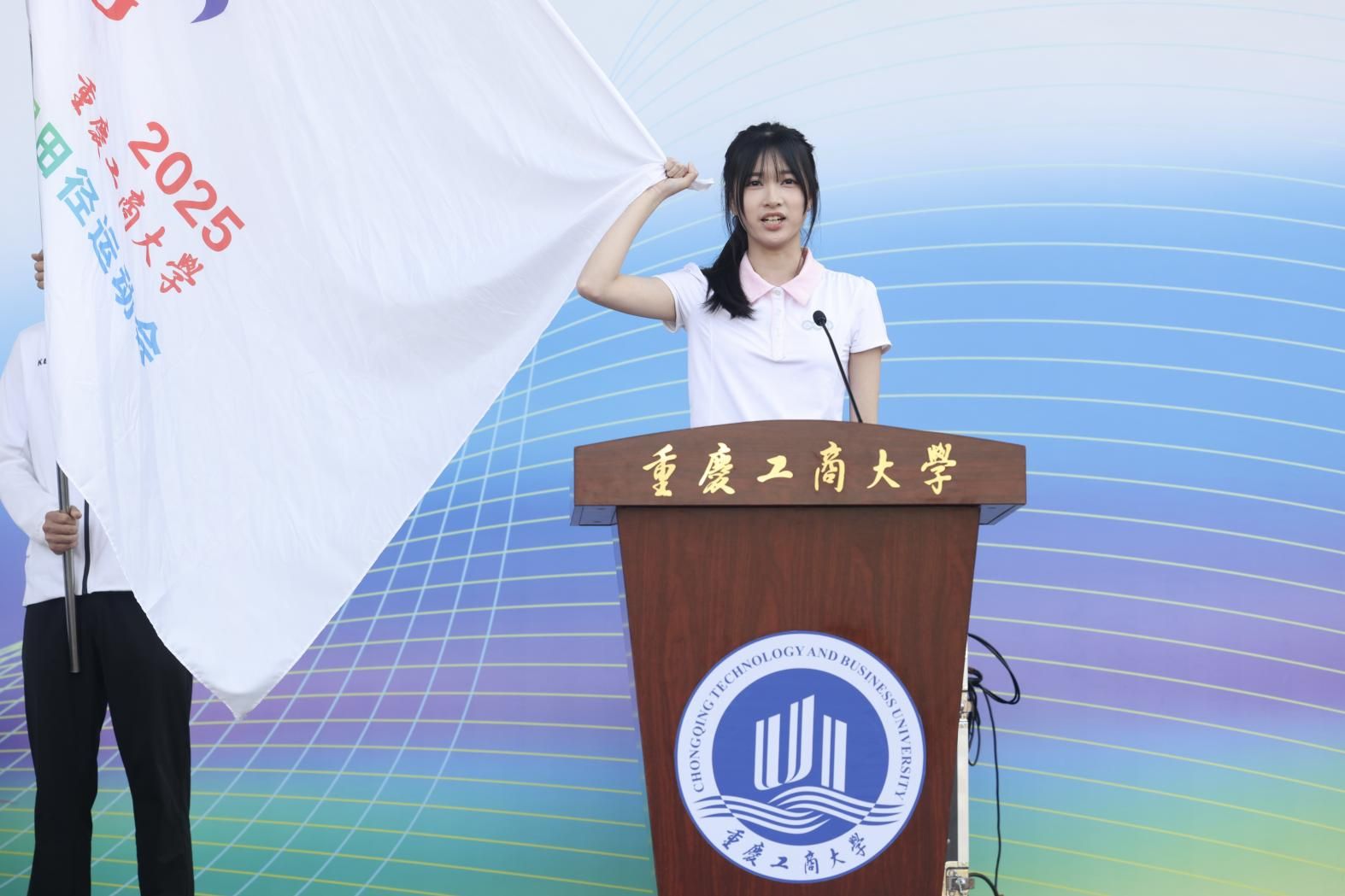 体育学院教师蒋愉、通识学院学生陈琪分别作为裁判员和运动员代表庄严宣誓,承诺以公平公正的态度和拼搏进取的精神参与赛事。