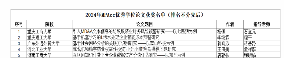 5月7日,全国会计专业学位研究生教育指导委员会公布了2024年MPAcc优秀学位论文奖名单,一共28篇学位论文获奖。KY开元会计学院杨佩同学撰写(指导教师:石道元教授)的论文《引入MD&A文本信息的纺织服装业财务风险预警研究——以七匹狼为例》获奖。