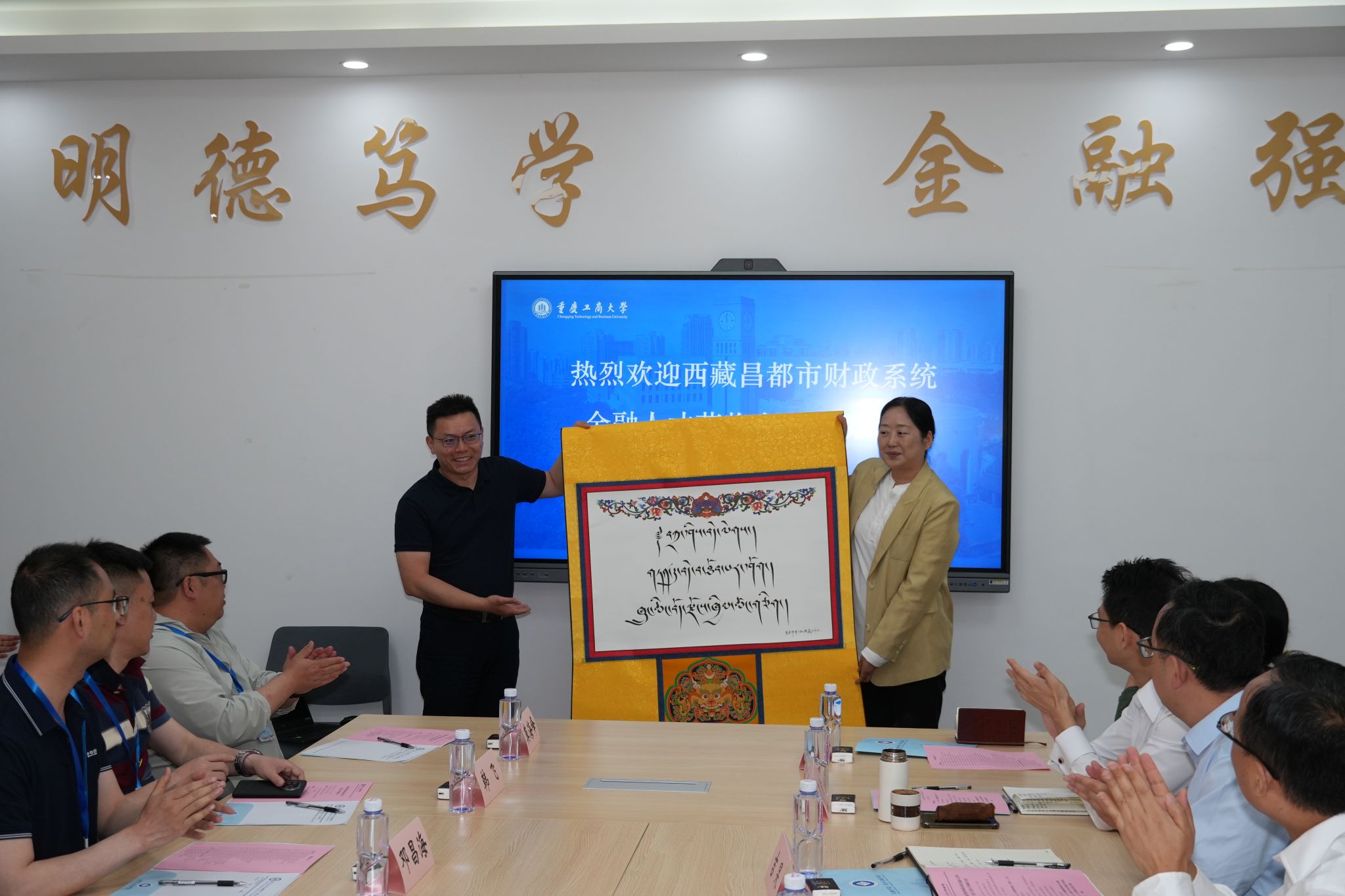 座谈会上,调研组向金融学院赠送了寓意“吉祥如意,重庆西藏一家亲”的藏文书法作品。