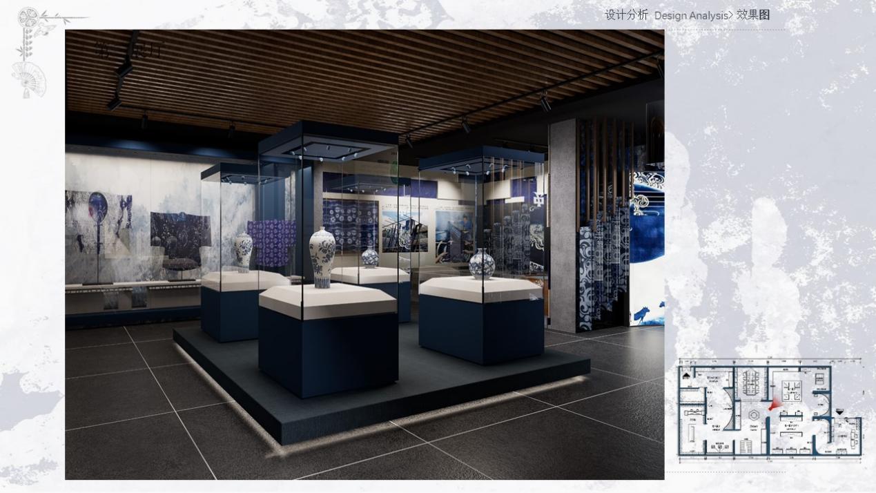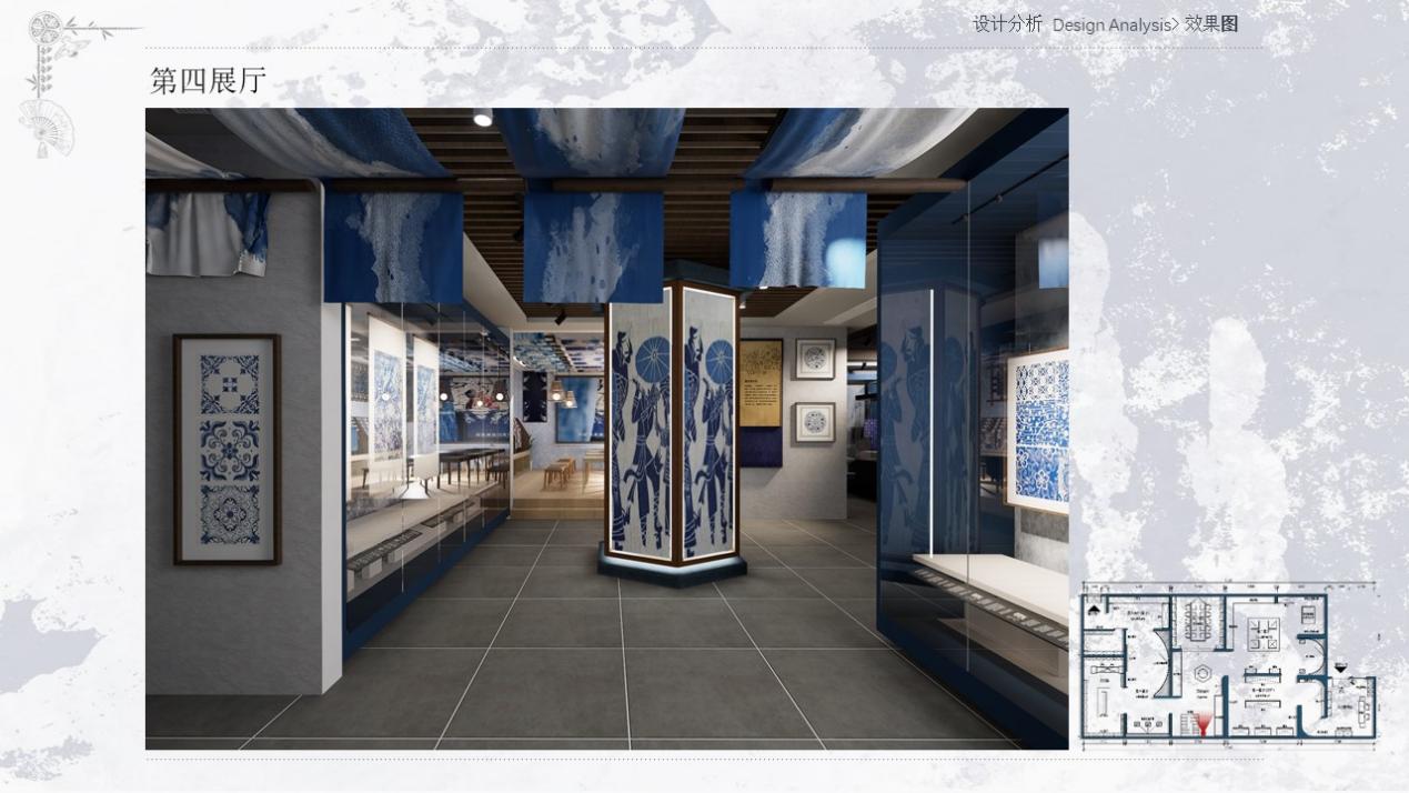 设计理念:党的二十届三中全会报告中强调全面推进乡村振兴,为贯彻落实习近平新时代中国特色社会主义思想,响应乡村振兴战略,将非物质文化遗产与乡村发展紧密结合,保护和传承中华优秀传统文化,为乡村经济社会发展注入新的动力,以此为宗旨设计此展厅。本项目选址于贵州省铜仁市松桃苗族自治县,此展厅类型是苗族蜡染数字艺术展厅,以松桃工艺蜡染为主题,展示了松桃蜡染这一独特的地域文化艺术形式。展厅融入蜡染作品中常用的蓝白主色调,搭配苗族文化中富有代表性的鲜艳色彩,引入AI/VR等数字技术手段,营造出既时尚又富有民族特色的空间氛围。