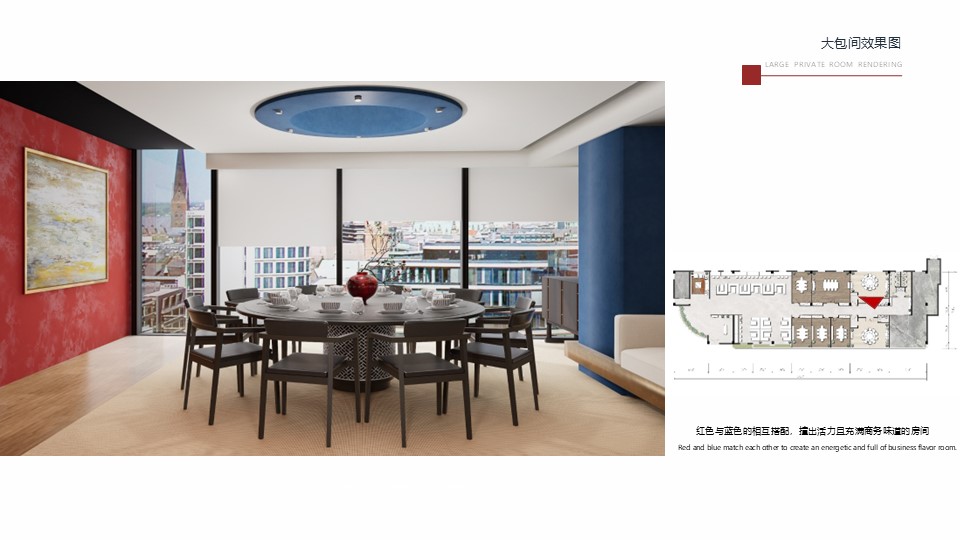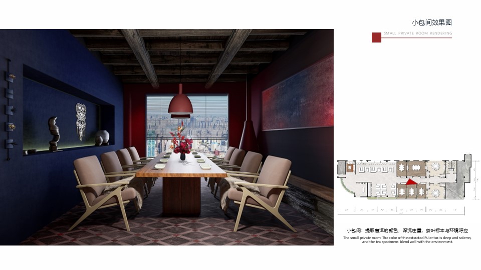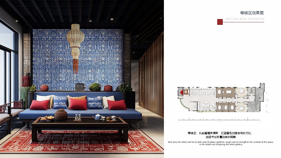 设计理念:在习近平新时代中国特色社会主义思想的引领下,大力推动文旅融合与乡村振兴,传承发展民族文化。项目选址为云南省大理市,餐厅以白族文化为主题,深度融入民族元素,以红蓝色为主色调,取意“点点红蓝于雪间”,增强艺术感与文化内涵。室内空间中运用了白族的特色文化元素,如扎染、白绣、彩绘等,搭配大面积落地窗,增强了光影效果与空间通透感,食客既可以享受美食也可以欣赏美景,全方位感受白族风情。设计落实了民族文化的传承发展,为乡村文化产业注入新活力。