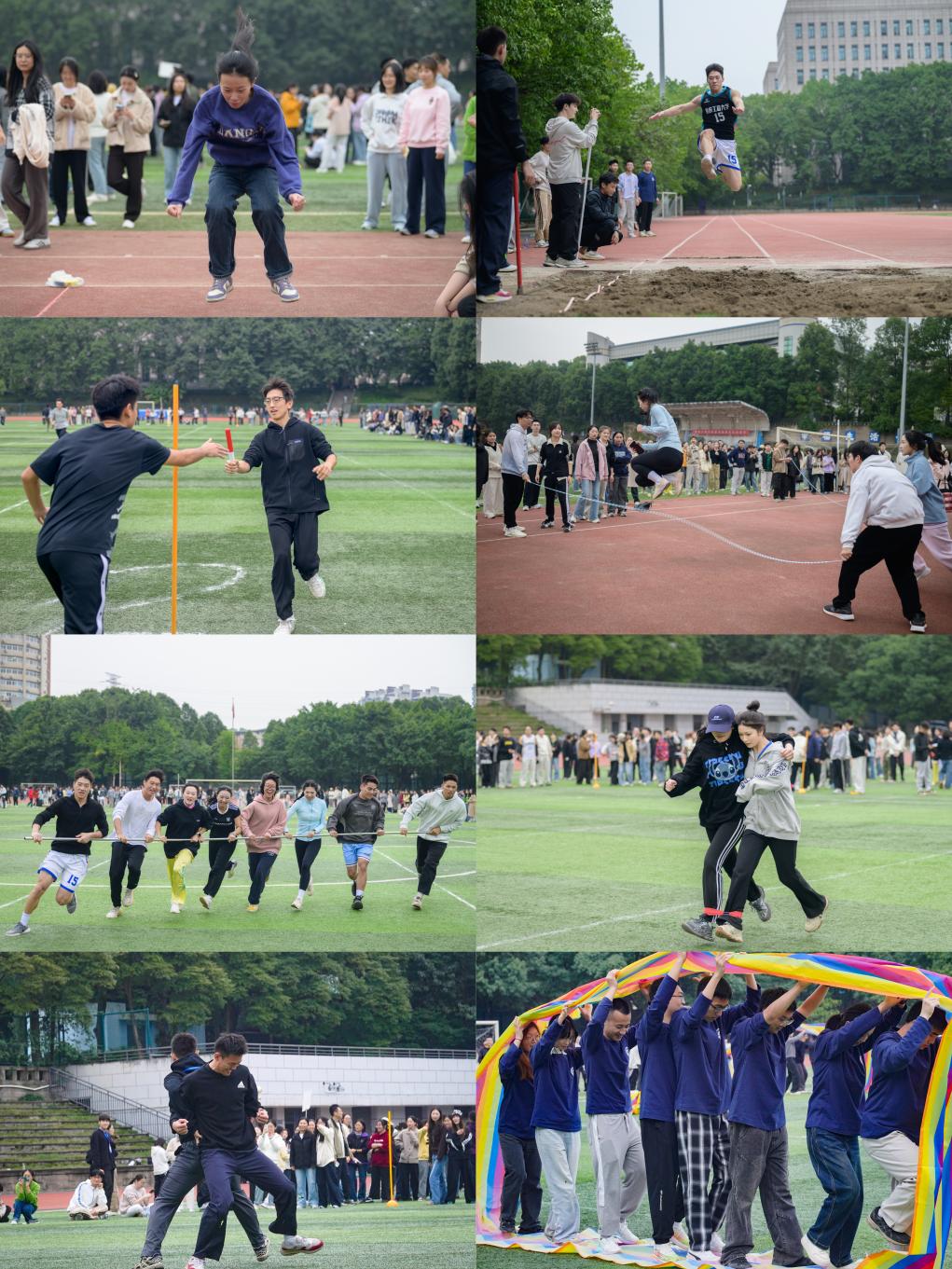 本次运动会设置个人单项和趣味集体项目两大模块,个人单项模块设置了立定跳远、急行跳远等项目,趣味集体模块设置了20人×50米迎面接力、集体“8”字跳绳、旋风跑接力、二人三足、背夹球、无敌风火轮等项目。