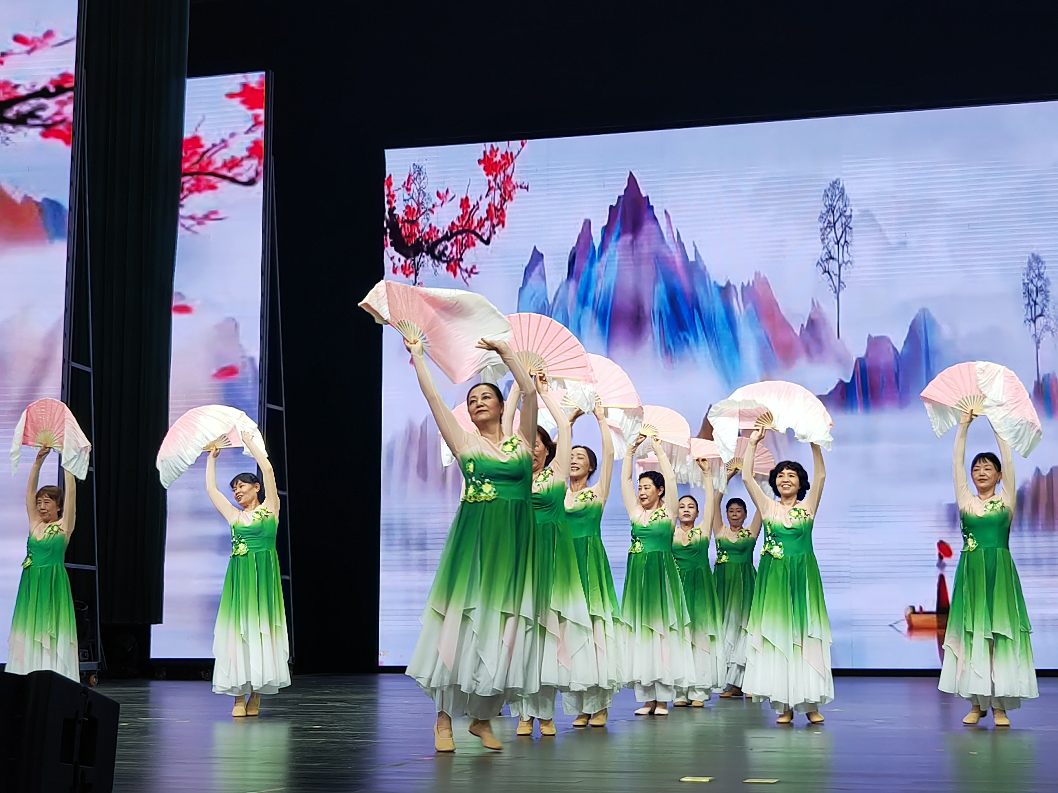 演出现场灯光音乐交汇,气氛热烈,器乐合奏《红歌联奏》;扇子舞《我的祖国》;女声独唱《我属于你中国》;《书法展示》;融合风《红笠雅韵》;京歌演唱《我是中国人》;《太极24式》;诗朗诵《中华颂》;大合唱《花又落》等9个精彩节目依次登台演出。演员们饱满的热情,良好的精神风貌,精彩绝伦的演出,赢得了观众们阵阵掌声。老年大学扇子舞《我的祖国》表演者姿态优雅,舞姿蹁跹,在悠扬的乐曲中以将整个展演推向高潮,给观众们以独特美的享受。文艺展演在全体合唱《没有共产党就没有新中国》的激昂歌声中圆满落幕。
