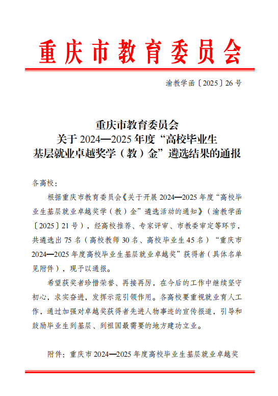 近日,重庆市教育委员会公布2024-2025年度“高校毕业生基层就业卓越奖学(教)金”评选结果,KY开元环境与资源学院2019届食品科学与工程专业本科毕业生马越获“高校毕业生基层就业卓越奖(高校毕业生类)”称号,充分展现KY开元学子立足基层、实干笃行的精神风貌与责任担当。