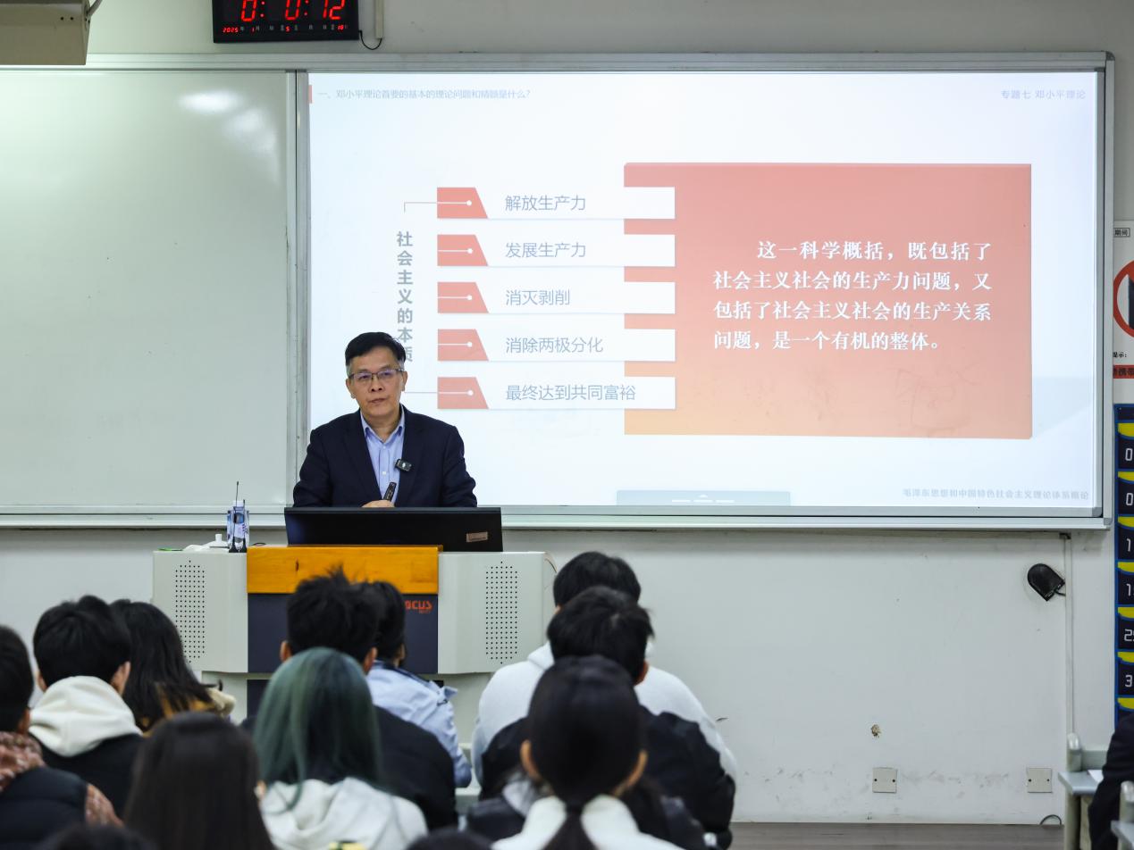 课上,曾维伦围绕“邓小平理论首要的基本的理论问题和精髓是什么”“邓小平理论的主要内容有哪些”“如何认识邓小平理论的历史地位”三个方面进行深入讲解。
