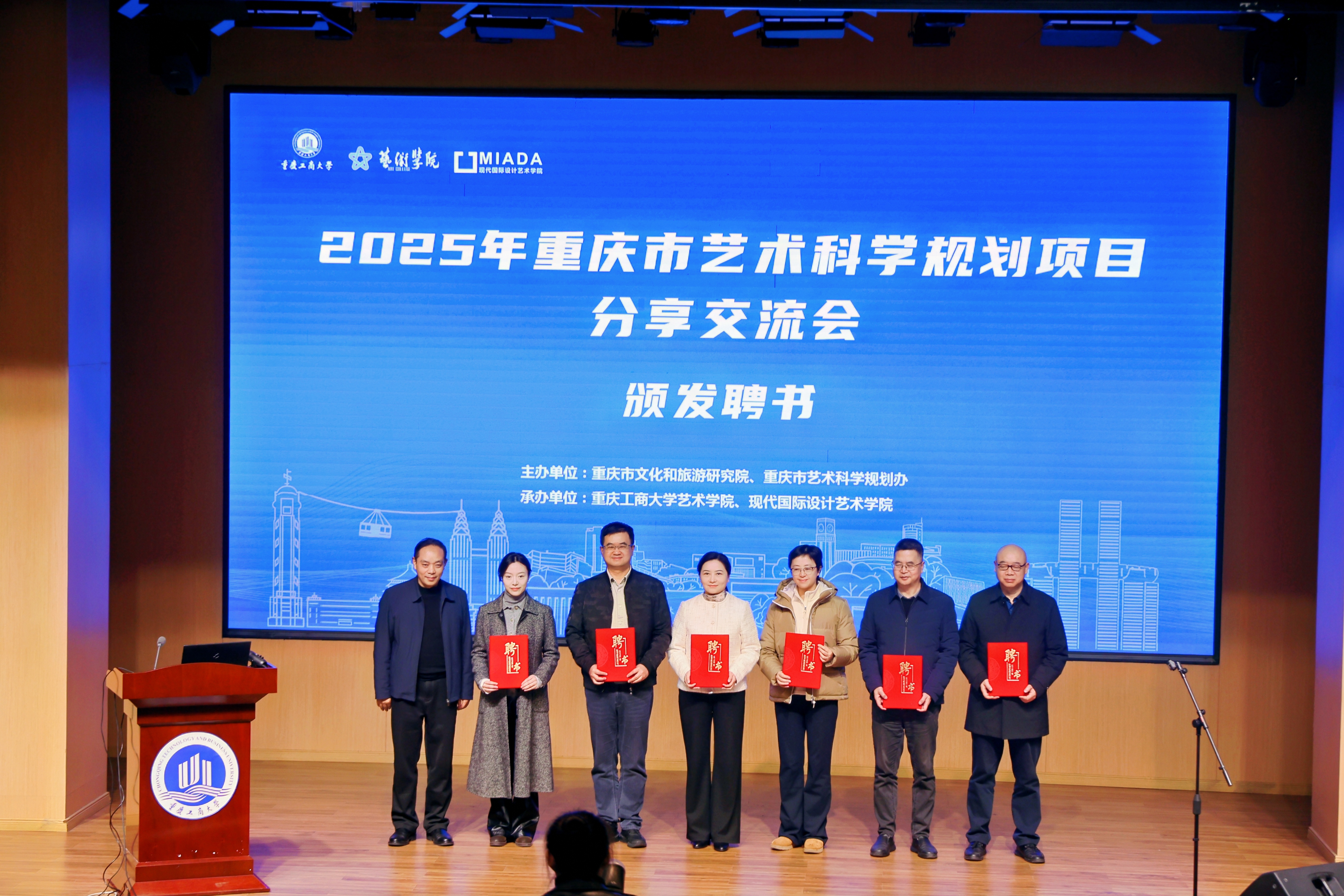 任毅代表KY开元集团官网致辞。牟元义通报2025年度重庆艺术学项目开展情况。与会领导为11位指导专家、分享专家颁发聘书。