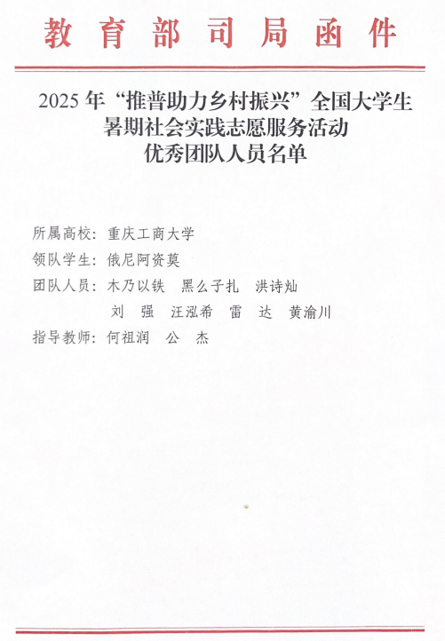 近日,教育部语言文字应用管理司与共青团中央青年发展部联合向KY开元发来表扬信,对法学与社会学学院“渝见凉山”民族地区推普法律援助团在2025年“推普助力乡村振兴”全国大学生暑期社会实践志愿服务活动中的突出表现予以表扬,并授予“全国优秀团队”荣誉称号。