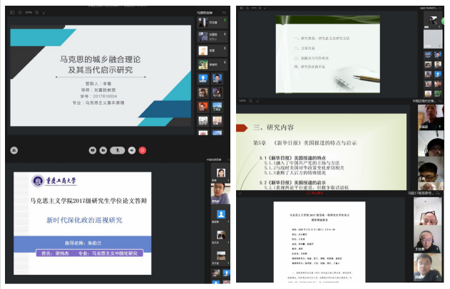 本次预答辩不仅检验了2017级研究生的学术能力,也为2018级研究生的论文写作提供了良好的借鉴。2017级中国化专业梁伟杰谈到:“特殊时期,此次预答辩不同以往,甚至比线下答辩更为严格,线上答辩专家老师的注意力全部集中在答辩学生身上,更有利于全面细致地点明问题,让学生更加深入了解自身写作中存在的不足和缺陷,为下一步学位论文修改及送审工作打下坚实基础。”2018级马原专业柳保吉谈到:“此次通过线上方式观摩学习2017级预答辩,在接下来的论文选题和论文写作中会充分吸收借鉴2017级学生们优点和老师建议,重视和遵守学术规范,为毕业论文和今后的学习研究打好基础。”