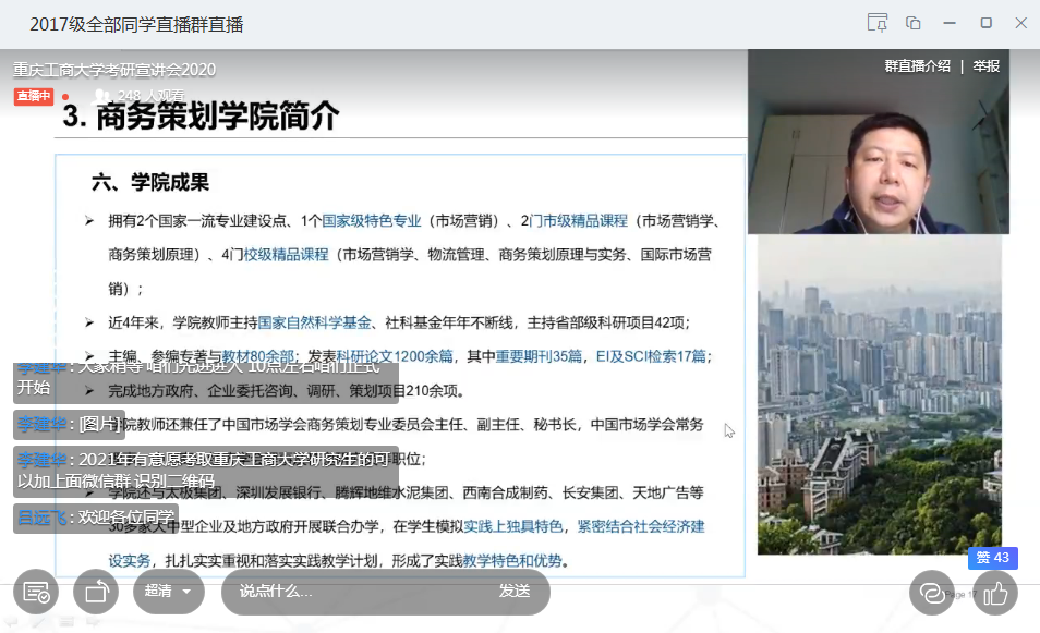 此次宣讲会经过数次与河南师范大学辅导员李建华老师沟通、协调得以如期举行。宣讲会通过钉钉直播的形式进行,河南师范大学商学院2017级、2018级部分未来有意考研的同学共600余人参与了此次直播。詹川首先介绍了重庆作为西部地区唯一的直辖市所具有的地域特点及发展优势,并对KY开元集团官网的办学规模、研究生师资及研究生培养情况作了简要介绍。接着,詹川详细介绍了商务策划学院企业管理及技术经济及管理学术硕士、国际商务专业硕士的专业设置、办学特点、师资力量、培养模式、学生就业以及奖助体系等情况。随后,学院2017级技术经济及管理专业研究生、河南师范大学校友李肖依同学,分享了她的考研历程及读研期间的个人感悟和收获。此次线上宣讲会还对2021年有意报考KY开元集团官网硕士研究生的同学们进行答疑解惑,以便同学们更加了解KY开元,认识当前考研形势,以及制定切实有效的考研计划。