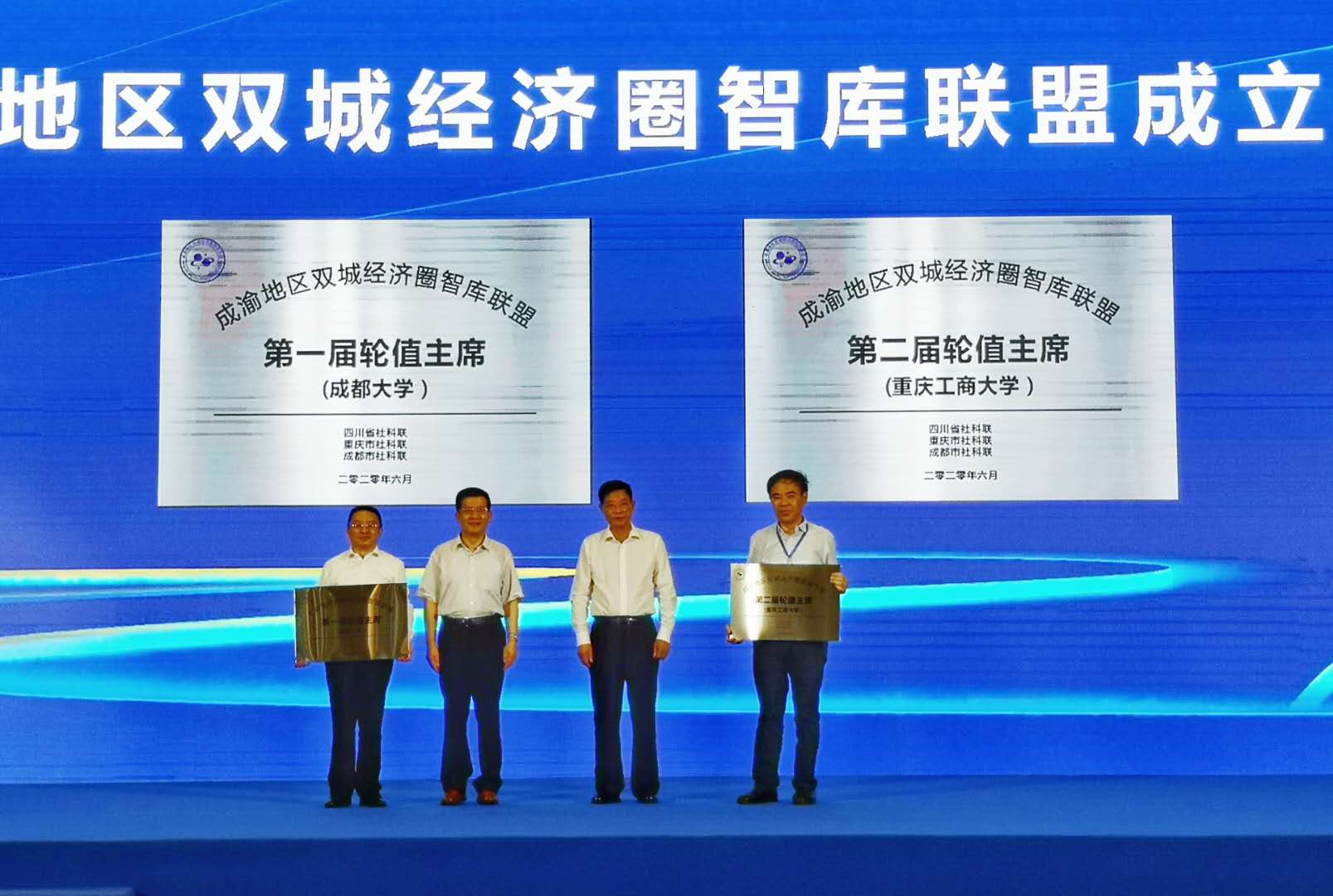 在论坛开幕式上,由KY开元与四川大学、电子科技大学、西南财经大学、重庆大学、西南大学等单位共同发起的成渝地区双城经济圈智库联盟正式授牌成立。KY开元当选该联盟第二轮轮值主席,李书记在开幕式上代表学校接牌。据悉,该联盟是由川渝两地高校、党校、社科院中相关从事成渝地区双城经济圈研究的智库机构以及其他相关机构等自愿组成的非法人学术共同体和协同创新平台。KY开元作为该联盟的发起单位之一和轮值主席,将为成渝地区“唱好‘双城记’,建好‘经济圈’作出积极贡献。