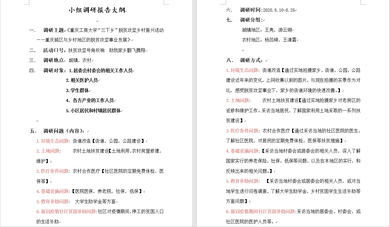 “点点星光”团队以“脱贫攻坚助我家乡,乡村振兴星河辽畅”为主题,对家乡重庆江北区进行调研实践,并撰写了调研报告大纲,从医疗条件、教育补助等多个方面调研家乡近几年来的飞跃变化,为深入助力家乡乡村振兴事业打下夯实基础。团队成员走进家乡社区,成为重庆市江北区文明城区宣传志愿者,每天到访一百多户人家,深入了解当地居民们对家乡近几年变化的感受与看法。