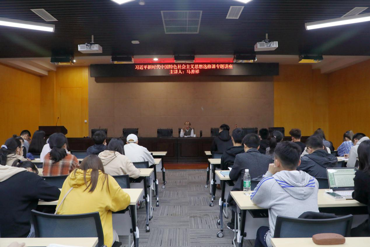 马善祥调解员以自己一干就是三十年的基层调解和群众思想政治工作为切入点,运用大量生动的语言、鲜活的事例,讲述了他牢固树立有追求、有自律、有勤奋、有坚持的“四有标准”,坚决拥护中国共产党领导、坚持以马克思主义理论武装头脑的心路历程,始终做到工作干起来、书本读起来、脑子用起来、提笔写起来,自觉将对党和国家的热忱与“为人民服务”的理想信念贯彻落实到具体工作当中,充分展示出他丰富的基层工作经验、扎实的业务功底和对群众高度负责的精神,深刻阐释了他如何活学活用马克思主义理论、不断提升党性修养、永葆思想的纯洁性与先进性。马调解员寄望同学们真正学懂弄通做实习近平新时代中国特色社会主义思想,努力做到学思用贯通、知信行合一,不断坚定理想信念,永远保持奋斗精神,继而在刻苦学习中练就过硬本领,朝着崇高的目标不断奋进。