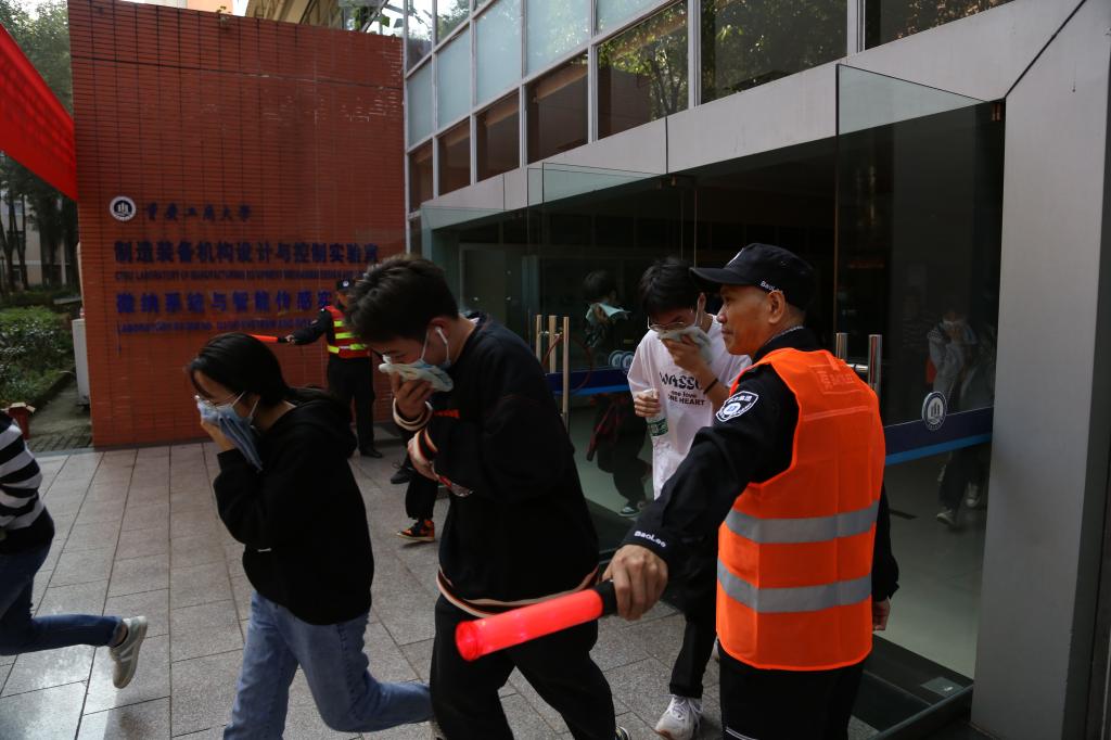 11月13日下午14:30,睿智楼物业值班员发现楼栋内“起火”,随即报告了保卫处。一时间楼内浓烟弥漫、智能消防系统警声大作,师生们在物业人员、实验室负责老师的引导下快速有序地从楼栋两个出口疏散……这是正在进行的KY开元2020年反恐灭火应急疏散演练。