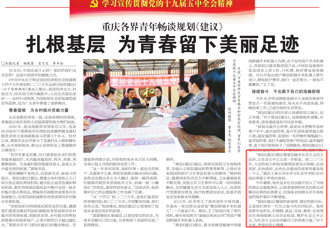 法学与社会学学院2018级法律硕士李青泊谈到,“规划《建议》提出要更加健全社会主义民主法治,让社会公平正义进一步彰显。到二〇三五年,人民的权力和权利能得到更充分保障,法治国家、法治政府、法治社会建设的成果将惠及每一个人。”今年暑期,他在返乡社会实践中加入了当地的普法志愿服务队,以故事案例的形式向群众讲解民法典的法条要义,切身体会到群众对自身权益的保护意识不断增强。他表示将发挥专业所长,在婚姻、就业、住房、教育、社保等民生领域保障人民合法权益,维护社会公平正义,为社会主义法治贡献自己的青春力量。