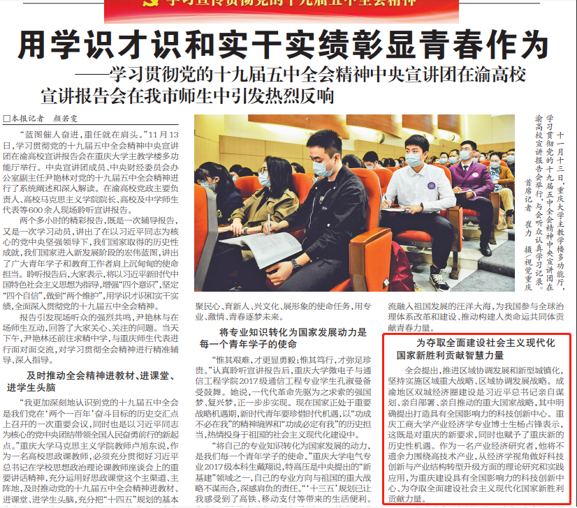 其中,杨占锋、李青泊两位同学的学习体会被《重庆日报》报道。