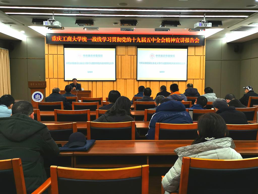 按照《KY开元集团官网学习宣传贯彻党的十九届五中全会精神工作方案》(重工商大委【2020】97号)相关要求,12月17日下午,学校在新图书馆会议中心一会议室举办统一战线学习贯彻党的十九届五中全会精神宣讲报告会,邀请中共重庆市委党校(重庆行政学院)张新华教授作宣讲报告。学校党委统战部常务副部长陈松主持宣讲报告会。学校非中共党员的市、区人大代表、政协委员,民主党派市委委员、区委主委(副主委),各民主党派基层组织和统战团体的领导班子、成员代表以及党委统战部干部,共计60余人参加了报告会。