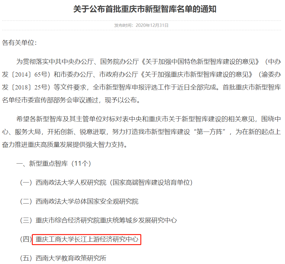 围绕智库建设,长江上游经济研究中心近年来积极组建科研(智库)团队、打造咨政平台、呈送智库成果,充分发挥了国家级智库作用。中心于2017年入选中国核心智库(AMI),并于2017年和2019年连续两次入选中国智库索引(CTTI)来源智库。本次入选首批重庆市新型重点智库,为中心智库建设写下了新的注脚。在以后的工作中,中心将对标对表国家和地方关于新型智库建设的指示精神,始终坚持问题导向,开拓创新、锐意进取,建言献策、贡献智慧,打造成为重庆市新型智库建设“第一方阵”,积极发挥智库作用。