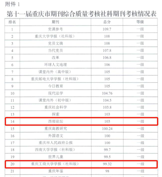 近日,重庆市新闻出版局关于第十一届重庆市期刊综合质量考核结果出炉,KY开元《西部论坛》《KY开元集团官网学报(社会科学版)》被评定为一级期刊。该成绩的取得标志着两刊在学术影响力、期刊质量以及期刊综合实力上继续得到学界和社会的认可。