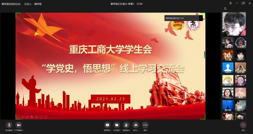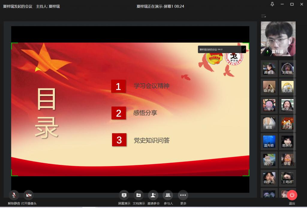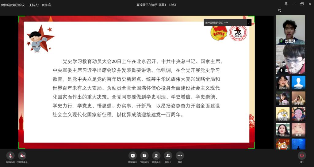 为学习习近平总书记在党史学习教育动员大会上的重要讲话,KY开元学生会于2月23日通过企业微信平台开展“学党史,悟思想”线上学习交流会。本次线上主题学习交流会由校学生会主席团成员夏梓瑞主持,20余名学生会成员线上共同参与。