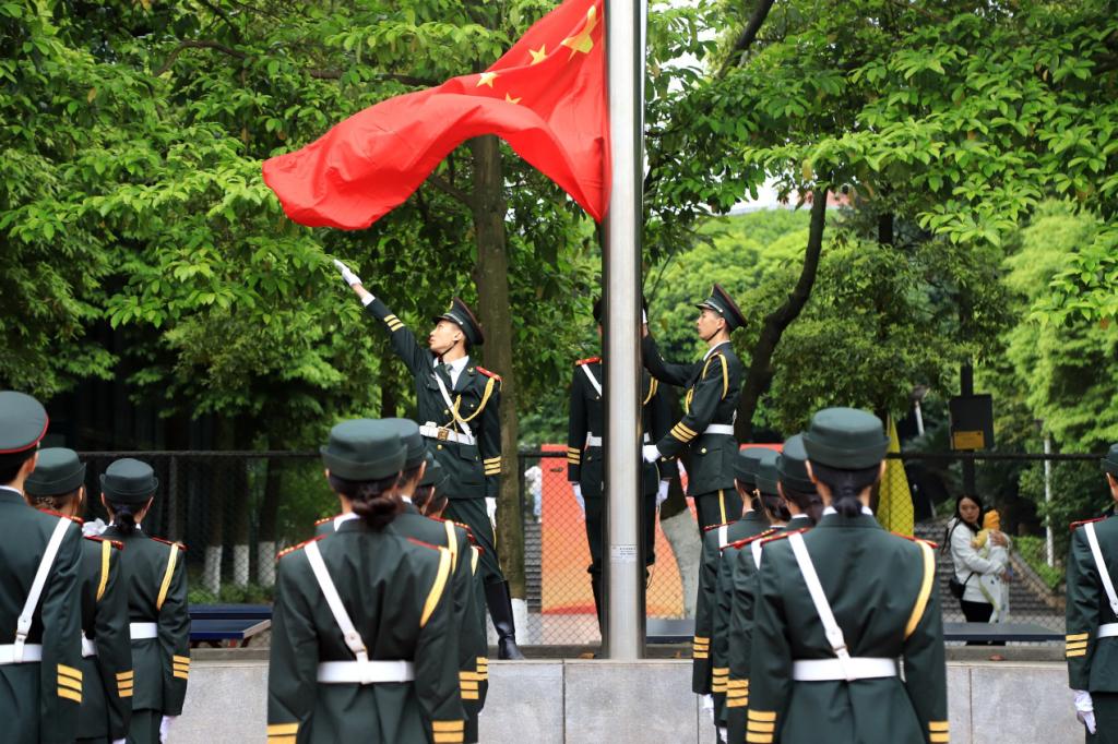 入场式上,国旗方队配合着音乐的节拍齐步行进,他们昂首挺胸,目光直视前方,展现了KY开元大学生的坚定信念、睿智机警。校旗、会旗、彩旗、红旗追逐着四月的微风,沐浴着春日的阳光,踏着整齐的步伐,展现着昂扬自信的精神面貌。